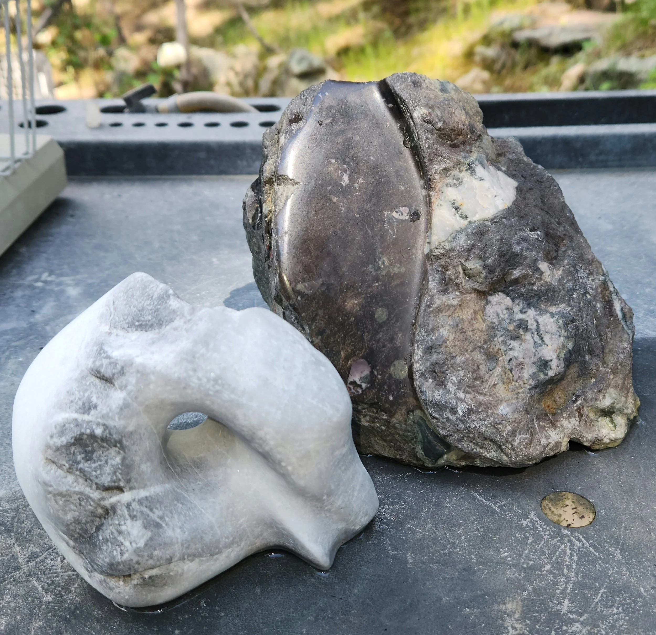 So far this summer, I've sculpted the four pieces in the photos. The Yule marble piece needs more sanding (not my favorite task) and mounted to a base. I don't know what type of stone the three dark stones are (Yep, I am not a geologist), but they are very interesting. The rock appears to have gems embedded in the stone. I want to visit the Golden Mine Museum in the hope that they will identify the rock. I'll let you know. As you may have seen, I usually mount my sculptures on a base, but this stone is so precious that I feel it could stand on its own. However, I am tempted to install a small hidden turntable. I love turntables because you can easily turn the sculpture to view all the angles.